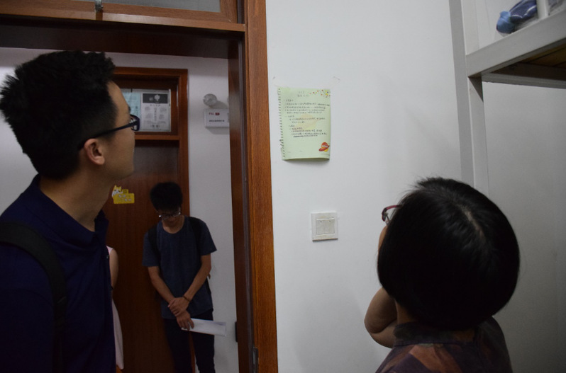 下午6点,各位院系领导和班主任老师来到T11宿舍楼,首先走访了公司外招生宿舍,了解港澳台同学们学习和生活状况。在10楼的一间外招生宿舍,一位来自台湾的大二同学告诉邵桂珍书记,广州没有台湾那么潮湿,气候让人感到很舒适,“生活了一年多,我们都很喜欢这里”,“因为番禺校区的宿舍条件很好”,他说。