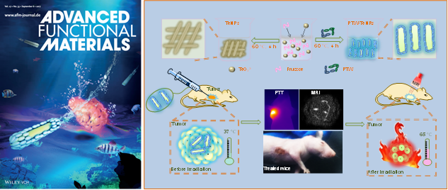 纳米药物的化学改造为肿瘤的诊断与治疗提供了新希望与新思路,陈填烽课题组一直致力于靶向纳米药物的化学设计及其在肿瘤诊疗中的应用及机理研究,最近,基于纳米材料的形貌及孔径调控,该课题组开发了基于纳米棒的高载药量光热转化纳米体系,实现了对肿瘤的同步化疗与热疗,拓展了肿瘤治疗的新思路。该成果连续在Advanced Functional Materials(影响因子12.124)发表两篇论文,其中一篇为封面文章。
