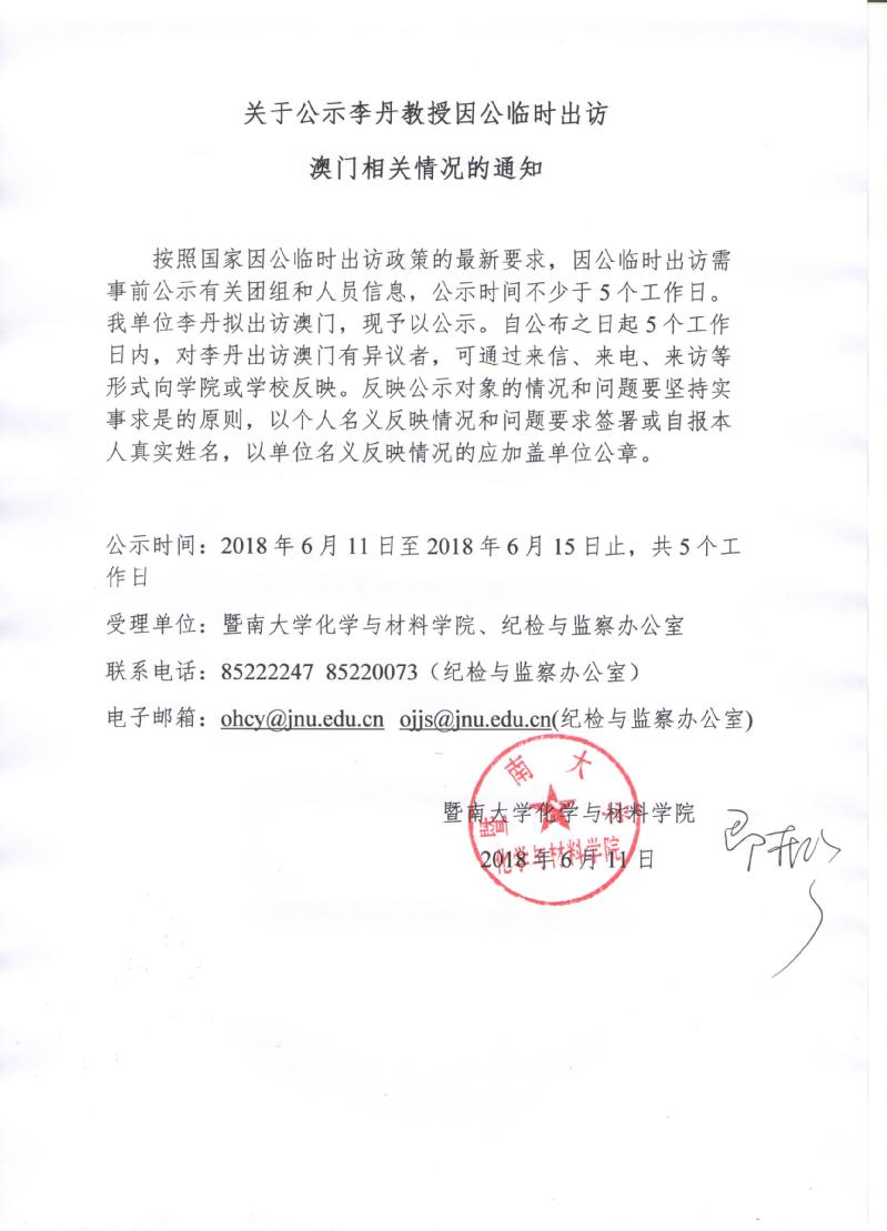 关于公示李丹教授因公临时出访澳门相关情况的通知