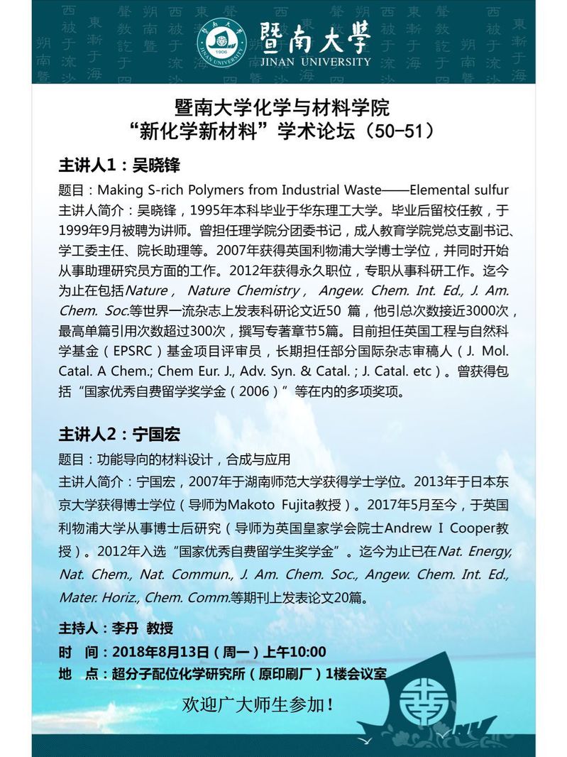 "新化学新材料"学术论坛(50、51)——吴晓锋、宁国宏教授