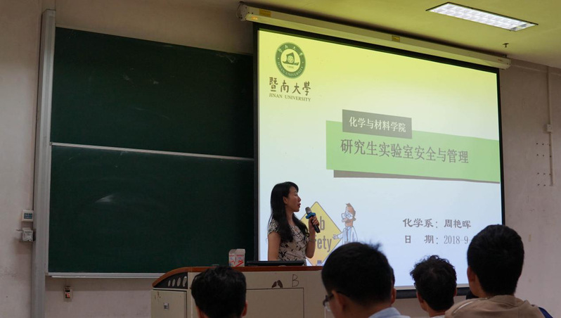 随后,化学系周艳晖老师进行了研究生实验室安全与管理相关事项的宣讲。周老师首先指出高校实验室安全的重要性,告诉大家在实验操作中,如何规避危险的发生,着重强调了同学们要主动自发的建立实验室安全意识,对自己对他人负责。最后,周老师讲述了发生意外后的正确处理方法。2018级新生杨晓涵说:“通过周老师的讲解,我们深刻地认识到了实验室安全的重要性,以后实验的过程中,将会更加注重实验安全,认真参与相关培训。”