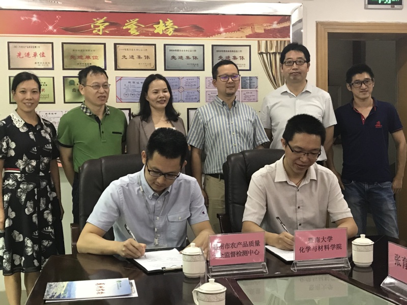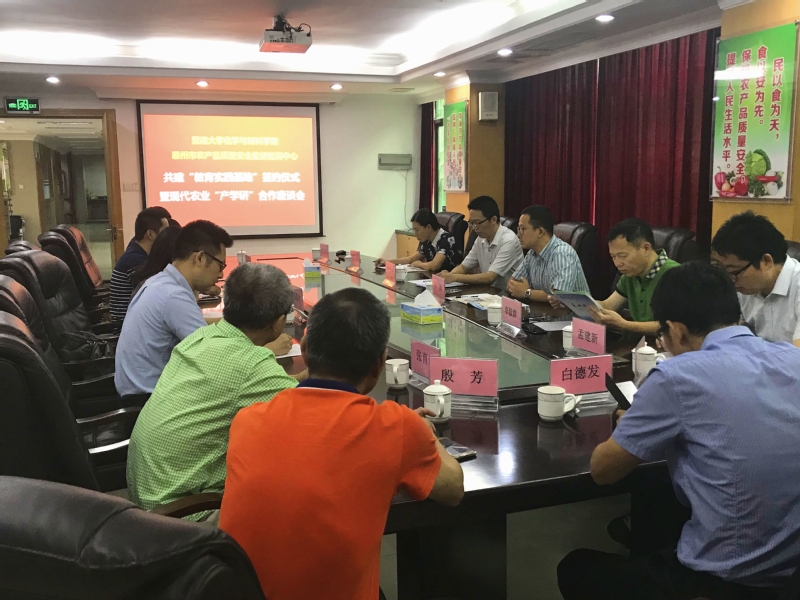 2018年9月28日上午,球速体育地方研究总院经理林满、科长白德发,公司副经理陈填烽、化学系主任李毅群、化学系党总支书记查海燕、化学系教授孟建新、公司实验秘书肖梦以及化学系员工陈义康一行8人前往惠州市农产品质量安全监督检测中心(以下称“农检中心”),参加共建“教育实践基地”签约仪式暨现代农业“产学研”合作座谈会。惠州市农业局副局长戴思宁、监察科科长张育明、总支书记殷芳、农检中心负责人陈孟君、四季绿和海纳两家农产品公司代表参加了座谈会。