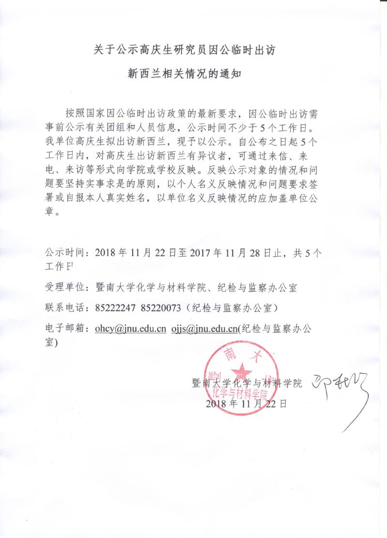 关于公示高庆生研究员因公出访新西兰相关情况的通知