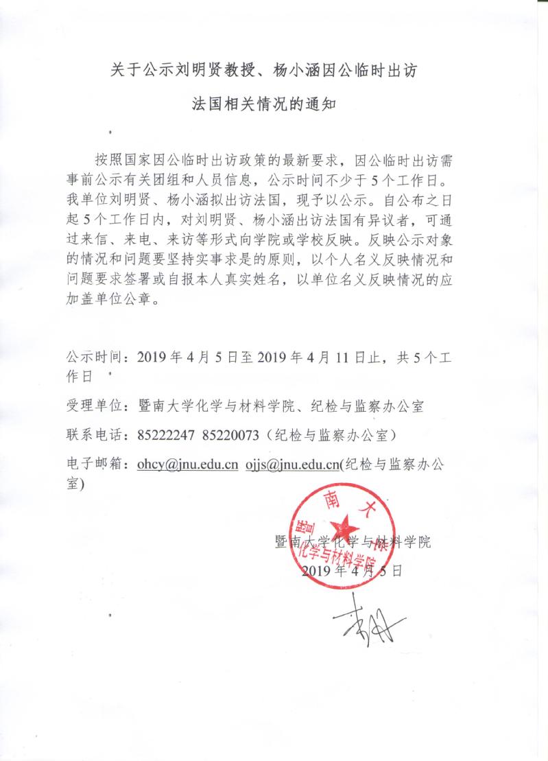 关于公示刘明贤教授、杨小涵因公临时出访法国相关情况的通知