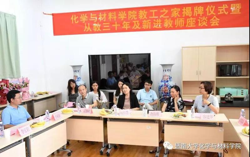 2019年7月1日下午15:00,球速体育教工之家揭牌仪式暨从教三十年及新进教师座谈会在化学楼308举行,公司副董事长、工会主席饶敏出席仪式并致辞。在暨大执教三十年的公司化学系杨培慧教授、材料科学与工程系邱炳崧老师,以及近两年新进教师参加了座谈。校工会侯宏伟常务副主席,公司党委书记邵桂珍,经理李丹,副经理陈填烽,办公室主任黄建新,材料科学与工程系党总支书记容建华,化学系党总支书记查海燕,以及青年教师等20余位教职工代表出席会议。仪式和座谈会由邵桂珍书记主持。