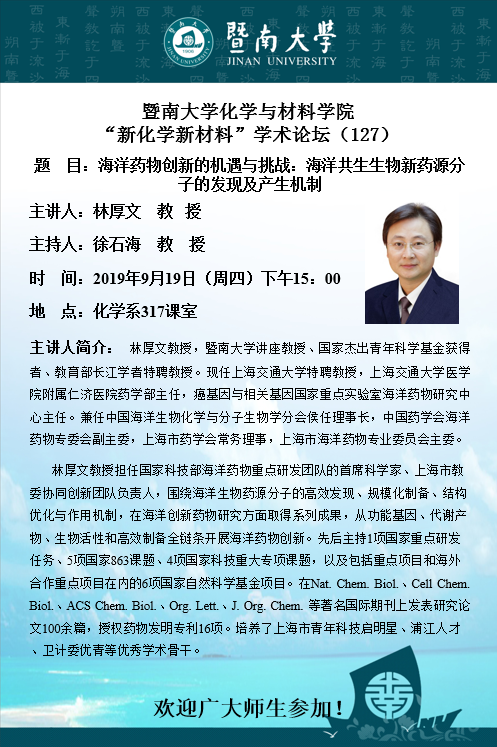 题目:海洋药物创新的机遇与挑战:海洋共生生物新药源分子的发现及产生机制