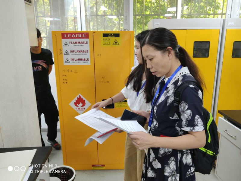 检查对象为石牌校区公司化学楼、第二理工楼、超分子配位化学研究所。参加检查人员有公司副经理陈填烽、材料科学与工程系总支书记容建华、化学系总支书记査海燕、实验员田金环、许佳怡、刘天宇,公司实验秘书肖梦,以及5名安全专员。检查组重点对危化品台账和标签、实验室水电气使用情况进行了检查,同时对环境卫生、消防安全进行了抽查。