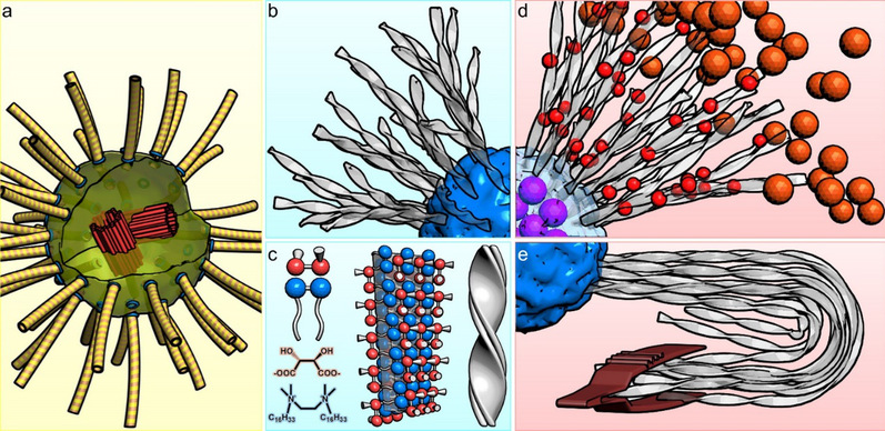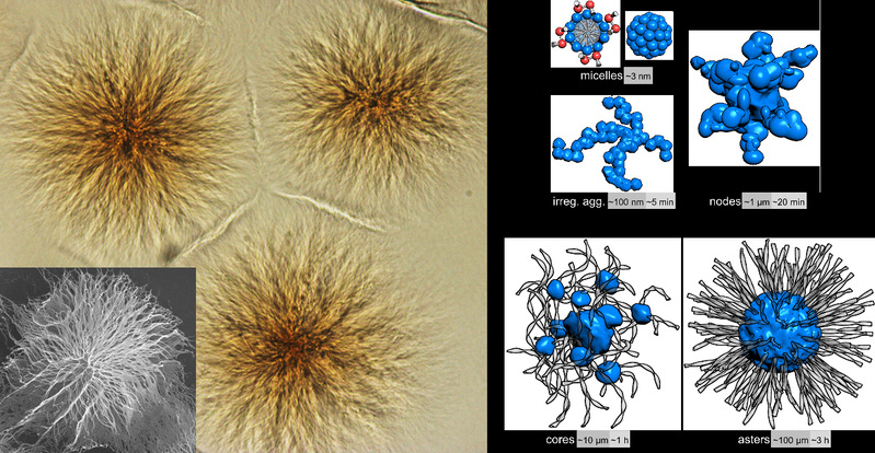 作者发现一种小分子能够在水溶液中通过自组装形成具有无定形核心和放射状螺旋结晶带的星状体,尺寸在50-150微米左右。每个星状体都是一个松散的骨架,其所占据的球形空间中包含约99.7%的水。对于邻近的星状体来说,它们的半柔性微丝交织在一起,在中间平面形成一堵可见的“墙”,从而阻止它们进一步相互穿透。分子组装成纤维通常是由经典的成核-生长机制决定的,在没有组织中心(organizing center)的情况下会产生随机排列的纤维网络(凝胶)。本体系与经典机制不同的是,小分子在纤维化之前先形成了亚稳态的无定形节点,它们作为组织中心(核心)最终转变为晶化的放射状丝带,在星状体形成中起到关键作用。