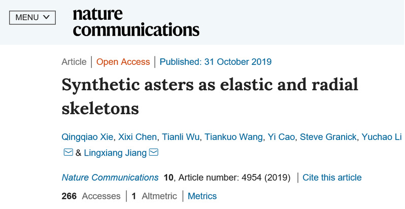 Qingqiao Xie, Xixi Chen, Tianli Wu, Tiankuo Wang, Yi Cao, Steve Granick, Yuchao Li,* and Lingxiang Jiang* Synthetic asters as elastic and radial skeletons, Nature Communications 2019, 10, 4954, doi: https://doi.org/10.1038/s41467-019-13009-4