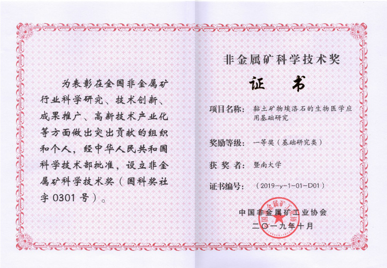 10月28日,中国非金属矿工业大会在广州举行。会上,中国非金属矿工业协会颁发了2019年度中国非金属矿科学技术奖,公司刘明贤教授、周长忍教授联合药公司何蓉蓉教授共同申报的“黏土矿物埃洛石的生物医学应用基础研究”获得基础研究类一等奖。这是公司首次获得该项奖励,也是今年非矿科技奖基础研究类的唯一一个一等奖项目。