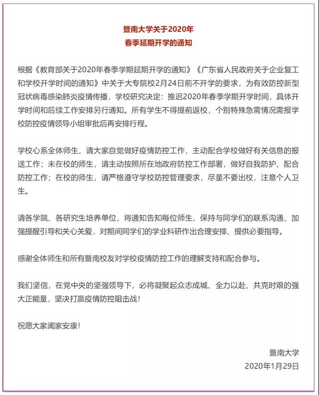 大家好!目前广东省已启动突发公共卫生事件一级响应机制,把疫情防控作为当前压倒一切的重要政治任务。为有效防控新型冠状病毒感染肺炎疫情传播,根据《教育部关于2020年春季学期延期开学的通知》《广东省人民政府关于企业复工和公司开学时间的通知》,公司1月29日发布的《公司关于2020年春季延期开学的通知》,通知要求所有员工不得在2月24日前提前返校,个别特殊急需情况需经公司同意报公司防控疫情领导小组审批后再安排行程;任何单位和个人不得批准员工提前返校;已离校的教职工建议不要急于返校,安心在家中进行科研工作;具体返校时间均以公司后续通知为准。