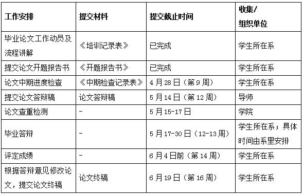 根据此前公布的毕业论文工作进度表(附件1),化学系、材料科学与工程系需做好在5月30日前完成员工毕业答辩的准备。