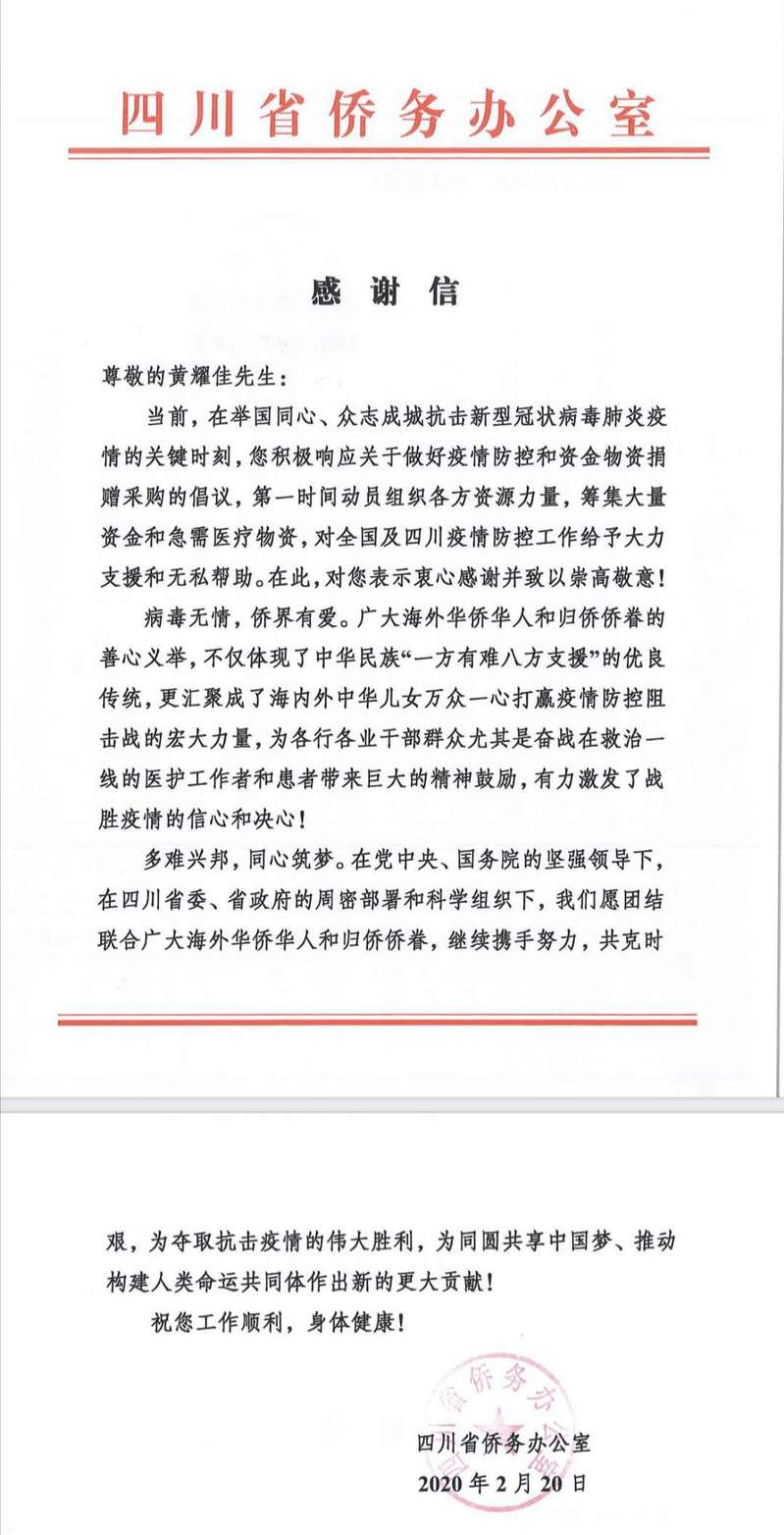 四川省侨务办公室寄给黄耀佳先生的感谢信
