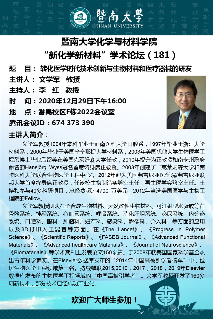 题 目:转化医学时代技术创新与生物材料和医疗器械的研发