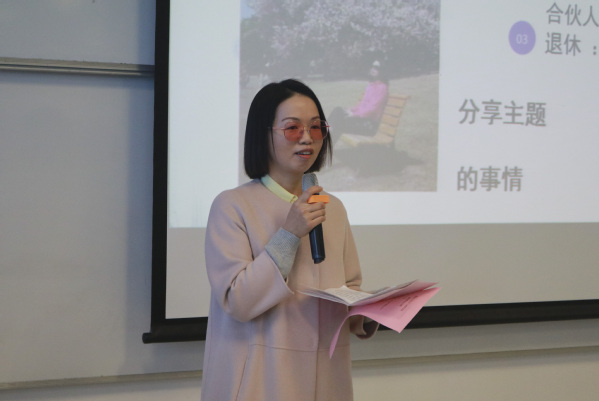 93级员工朱燕倩分享了自己就业—创业——“退休”的故事。她说,要想实现财务自由,首先要明白自己想要什么,然后不断努力去实现它。她提醒同学们,大学四年对未来人生的影响十分重要,大家应努力发掘自己的核心竞争力,规划人生目标,形成独立人格,为进入社会做好准备。她真诚提醒同学们,人生需要靠自己的奋斗去定义,并没有最优选项,希望大家珍惜时光、不要虚度青春。