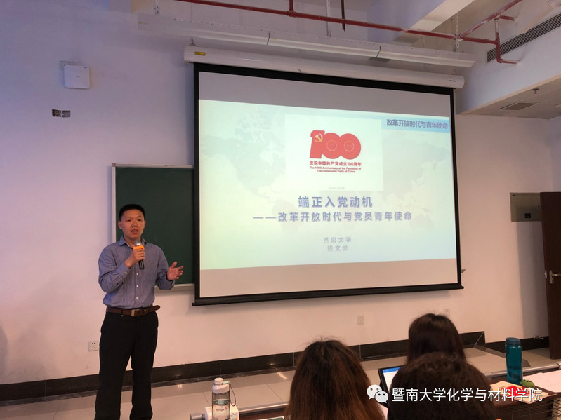 4月8日下午,法公司、国际关系公司、球速体育联合分党校第87期党员发展对象学习班第二讲在番禺校区教学楼521教室举行,公司党委副书记、分党校副董事长陈文举为学员上了题为“端正入党动机——改革开放时代与党员青年使命”的党史专题党课。联合分党校的100名学员聆听了党课。