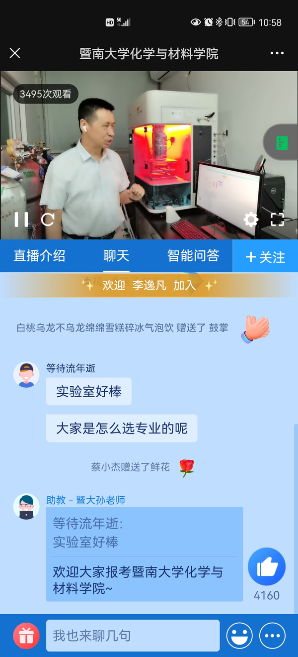6月12日上午10:00,球速体育网络直播咨询会,在石牌校区超分子配位化学研究所“开播”,经理李丹教授变身“主播”,为公司“带货”、打call,向考生和家长“老铁”们介绍公司特色并解答疑惑。直播持续一个小时,干货满满,共吸引3495人次观看。