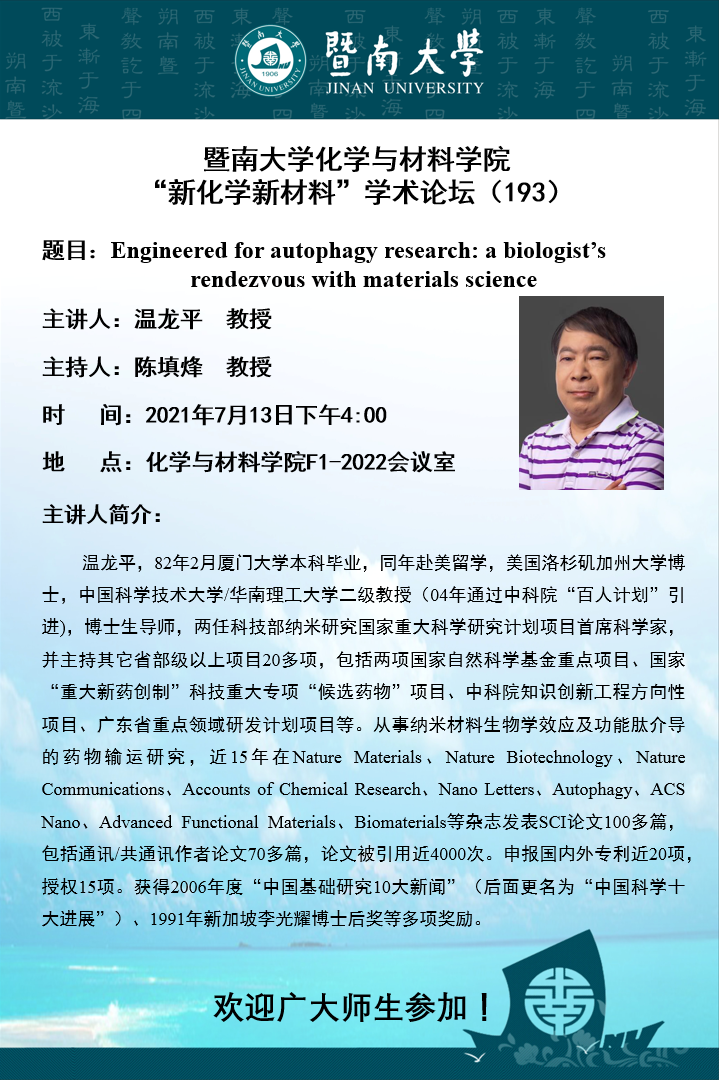 题 目:Engineered for autophagy research: a biologist’s rendezvous with materials science