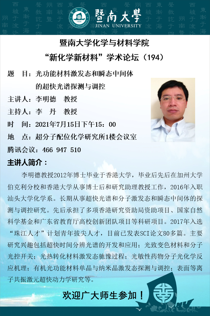 题 目:光功能材料激发态和瞬态中间体的超快光谱探测与调控
