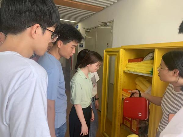 随后,实验中心组织实验技术人员到各实验室附近的安全应急柜、应急喷淋处,向员工介绍应急柜内物品名目及使用方法,并让员工实操应急喷淋与洗眼器的使用。