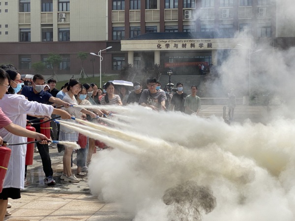 本次活动内容分为两项:第一,由番禺校区保卫办进行的消防器材使用讲解和实操演练;第二,由公司实验中心进行的安全应急柜、应急喷淋洗眼设施的认知与使用培训。
