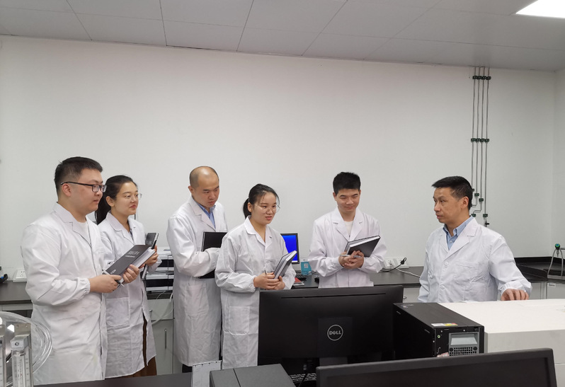 李丹教授(右一)指导曾恒(右二)和研究所其他团队成员