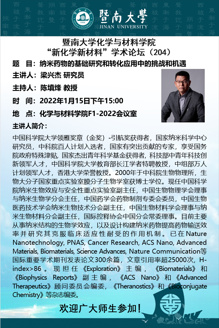 题 目:纳米药物的基础研究和转化应用中的挑战和机遇