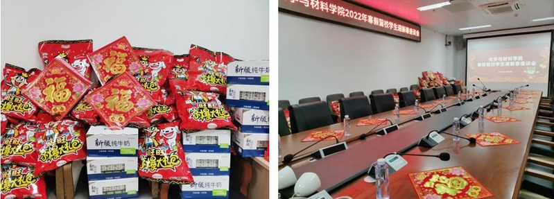 虎年春节将至,为给留校同学营造欢乐喜庆的春节氛围、做好寒假期间校园疫情防控和留校员工服务工作,1月26日、27日,公司党委书记邵桂珍、党委副书记陈文举、材料科学与工程系党总支书记容建华,化学系党总支书记查海燕和员工辅导员一行,在番禺校区及本部超分子配位化学研究所与留校本科生、研究生举行迎新春座谈,前往番禺校区实验室及南村走访慰问留居的研究生、本科员工,了解他们的假期学习生活情况和计划,给予同学们周到的建议和温馨的提醒,并为他们送上新春大礼包、春联、“福”字,致以新春问候和祝福。