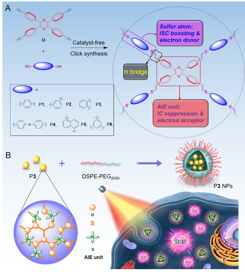 基于此,陈明等人以便捷、高效、原子经济的巯基-炔点击反应为媒介,通过在分子中原位引入硫“重原子”,获得了高单线态氧产生效率的有机硫光敏剂,给便捷设计高性能光敏化材料提供了新的思路。此外,基于硫原子效应,设计含硫聚合物,可进一步增强ISC,放大光敏;而在光敏剂中引入AIE单元,可抑制光敏剂激发态的非辐射跃迁,对增强光敏也起着重要作用。此外,光敏剂中的硫原子、双键和AIE分子可分别作为电子给体、π桥和电子受体,构建给体-π-受体(D-π-A)结构,使其拥有优越的双光子激发性质。