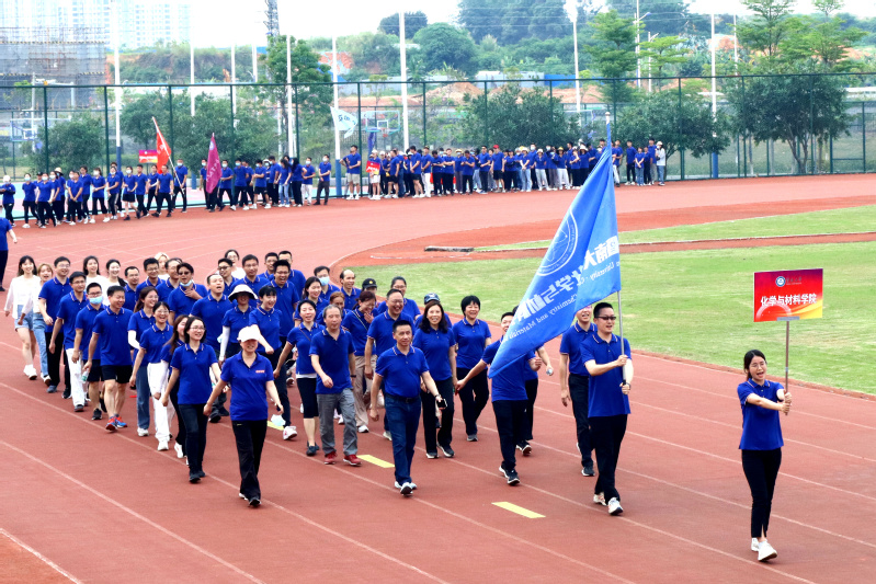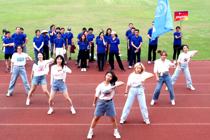 化材院队伍迈着整齐的步伐,喊着响亮的口号来到主席台前,舞蹈队的同学们伴随音乐跳起创意舞蹈,为老师们加油助威。