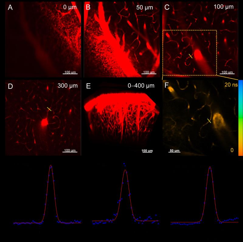 图2 (A-D)小鼠脑血管在不用深度下的双光子成像图片;(E)在0-400微米深度成像图片所构建的3D图;(F)脑血管在100微米深度的双光子激发荧光寿命成像图;(G-I)在(C、D和F)图中沿着血管所画直线上获得的荧光强度及所推演的血管直径和成像信噪比。