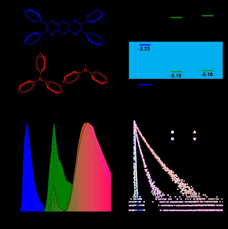 图 1 (A)吡嗪类AIE受体分子和芳胺类给体分子的结构;(B)给受体分子从电化学和紫外-可见光谱推演的能级;给受体分子及其复合物在薄膜态的(C)荧光光谱和(D)荧光衰减曲线。