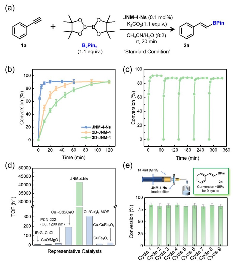 图3. (a) JNM-4-Ns催化苯乙炔的硼氢化反应;(b) JNM-4-Ns、2D-JNM-4和3D-JNM-4的转化率与反应时间的关系图。(c) JNM-4-Ns催化剂的可循环性。(d) JNM-4-Ns的TOF与文献中用于苯乙炔硼氢化反应的催化剂比较。(e) 基于JNM-4-Ns的流动反应器示意图(上)和其对苯乙炔硼氢化反应的优异催化效果(下)。
