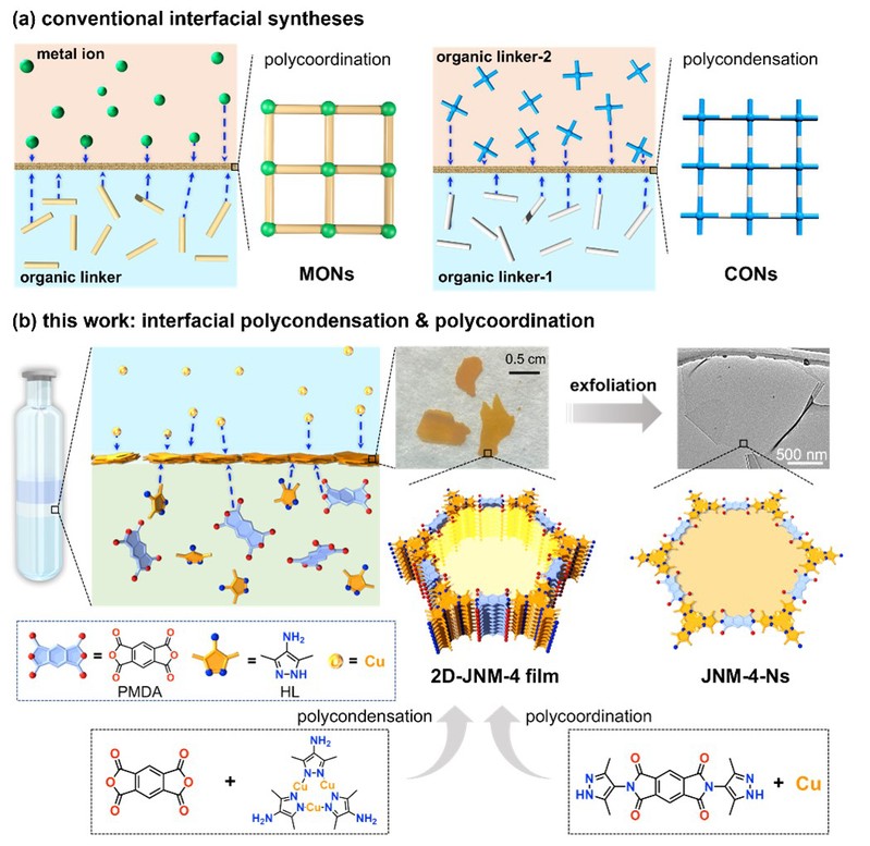 图2. (a) 构建MOF/COF纳米片或薄膜的常规界面合成法;(b) 本研究提出的基于三种活性单体和两种聚合反应(即缩聚反应和配位聚合反应)的新型界面合成方法。