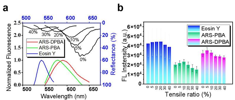 图3. 可拉伸PC膜的可调谐荧光增强:(a) PC膜随拉伸率变化的禁带与荧光染料ARS-DPBA, ARS-PBA和曙红Y发射峰的匹配情况; (b)PC膜上荧光斑点的荧光强度随拉伸率变化而改变,其对不同光谱区域的荧光有不同程度的增强。