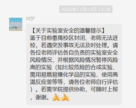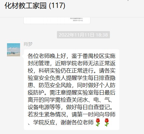要务必落实主体责任,妥善安排行政人员、实验技术人员和老师驻守校区,加强教学督导巡课和课下阅读指导,确保线上指导科研、线上教学工作质量。向各位研究生导师发送温馨提示,强调要关心关爱员工,特别是对锦溪苑的员工,了解其学习生活动向,及时回应问题;加强员工线上指导和实验安全指引,保障校区内的实验安全;提醒员工不在实验室、办公室使用大功率电器或给电动车充电;对锦溪苑的员工要布置阅读文献、安排理论研讨等非实验工作任务;引导员工正确看待疫情防控形势,按要求参与核酸检测,坚持健康打卡,做好个人防护。