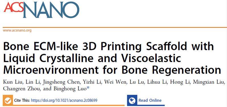 近日,暨南大学球速体育罗丙红教授团队在《ACS Nano》(影响因子18.027)上发表了题为“Bone ECM-like 3D Printing Scaffold with Liquid Crystalline and Viscoelastic Microenvironment for Bone Regeneration”的重要研究成果(图1)。