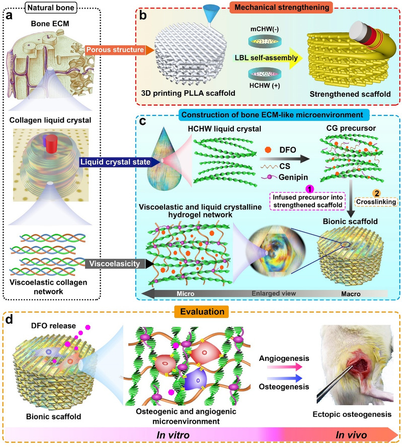 在骨缺损处植入3D打印支架是个性化骨缺损修复的有效策略。作为决定骨组织工程成功与否的关键因素,支架材料应兼有适宜的骨再生微环境和优异的力学性能。事实上,最理想的成骨微环境无疑是天然骨细胞外基质(ECM),它具有独特的液晶态和粘弹性特征。然而,如何将类骨ECM微环境与具有优异力学性能的三维支架有机结合始终是一个巨大的挑战。