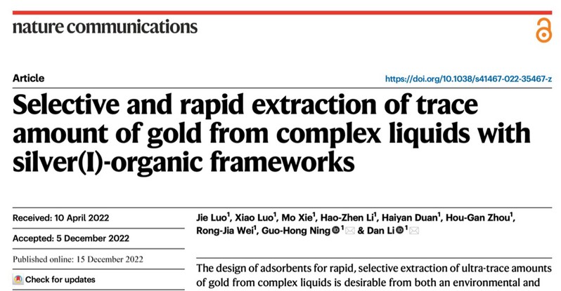 近日,球速体育宁国宏/李丹教授团队以球速体育为唯一单位于2022年12月15日,在Nature Communications(IF=16.9)上发表了题为 “Selective and rapid extraction of trace amount of gold from complex liquids with silver(I)-organic frameworks” 的重要研究成果(图1)。