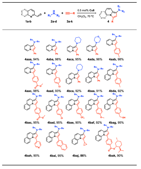 凭借优异的化学稳定性,Cu8被认为是一种很有前途的催化剂。同时,吲哚嗪作为一种药物骨架,在生物领域中具有重要作用。因此,使用Cu8作为催化剂,以2-吡啶甲醛衍生物、仲胺和末端炔烃为原料以较高的收率合成了19种吲哚嗪类化合物(表1),表现出较为广泛的底物适用性。对于模板反应,Cu8的TOF高达3880 h−1,比已报道的催化剂高2-3个数量级,并且可以重复使用至少10次循环而不损失催化性能。