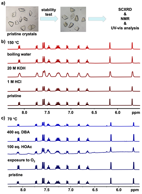 柔性双吡唑配体 (H2L1)在溶剂热条件下,发生配体原位反应形成了两个新去质子化的配体(即 L2 和 L3),L2、L3与Cu(OH)2再组装形成八核铜簇(Cu8)。由于具有吡唑封端配体的钝化壳以及吡唑和亚铜离子之间的强化学键,使得Cu8 在固态和溶液中均具有超高的化学稳定性。例如, Cu8 的晶体在1 M HCl、饱和KOH溶液(~20 M)、沸水、甚至8 wt% H2O2溶液浸泡一段时间后,仍然适用于单晶X-射线体衍射分析。更有趣的是,核磁和紫外-可见吸收光谱分析表明,向 Cu8 的氘代二氯甲烷溶液中添加100当量乙酸、160当量三乙胺或者400当量二丁胺都不会引起结构分解(图3)。