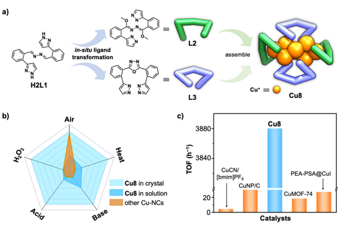 图2 (a) 通过配体原位反应制备原子精确的吡唑基铜纳米团簇(Cu8)的示意图;(b) 评估Cu8和其他铜纳米团簇的化学稳定性的雷达图;(c) 基于Cu8和一些代表性催化剂用于合成吲哚嗪的TOF比较。
