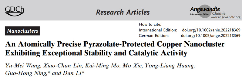 近日,球速体育宁国宏/李丹教授团队以球速体育为唯一通讯单位于2022年12月28日,在Angewandte Chemie International Edition(IF=16.8)上发表了题为 “An Atomically Precise Pyrazolate-Protected Copper Nanocluster Exhibiting Exceptional Stability and Catalytic Activity” 的重要研究成果(图1)。