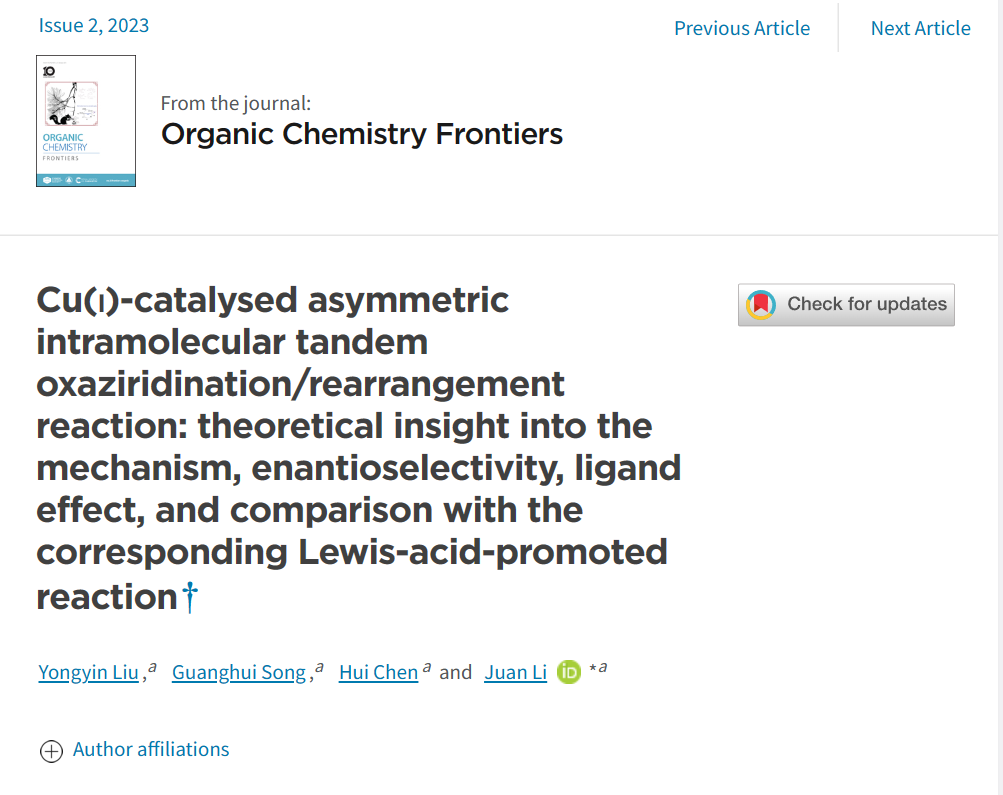 近日,球速体育2020级应用化学2班本科生刘咏茵以第一作者(指导老师:李娟)在有机化学领域知名期刊Organic Chemistry Frontiers发表题为Cu(Ⅰ)-catalysed asymmetric intramolecular tandem oxaziridination/rearrangement reaction: theoretical insight into the mechanism, enantioselectivity, ligand effect, and comparison with the corresponding Lewis-acid-promoted reaction的研究论文。该期刊为有机化学学科旗舰刊物,中科院JCR1区收录,影响因子5.456。