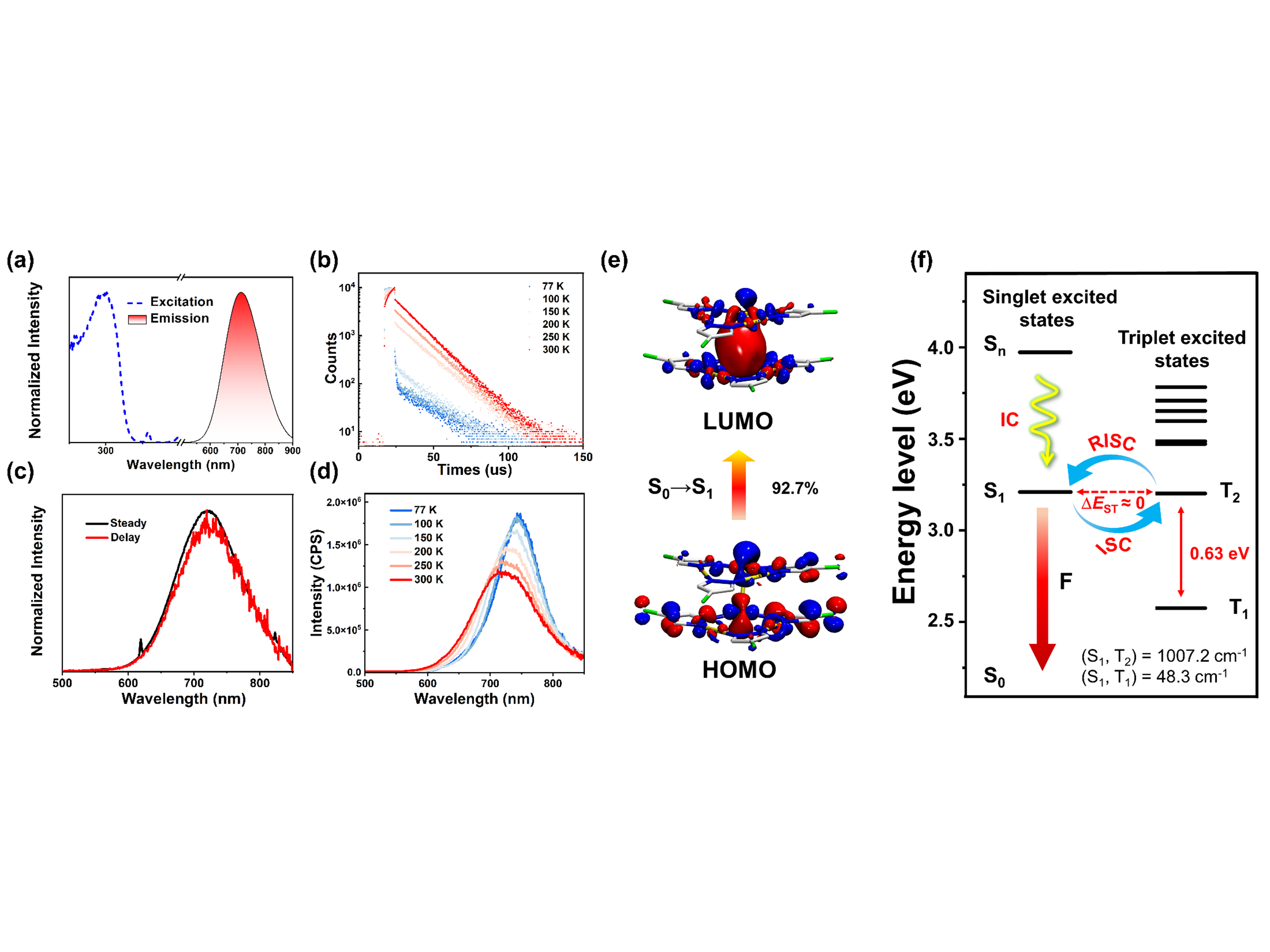 室温/变温稳态光谱、瞬态光谱、绝对量子产率以及变温寿命测试等光谱学手段表明Cl-Au和Br-Au的发射为高效的NIR-TADF(λmax = 720 nm,PLQY>70%)。理论计算进一步验证了TADF的发射机理(图3),并揭示S1和T2(S为单重态,T为三重态)较小的能量差以及配体到金属-金属的电荷转移(1LMMCT)诱导的较大的旋轨耦合常数是产生如此高效NIR-TADF的关键因素。