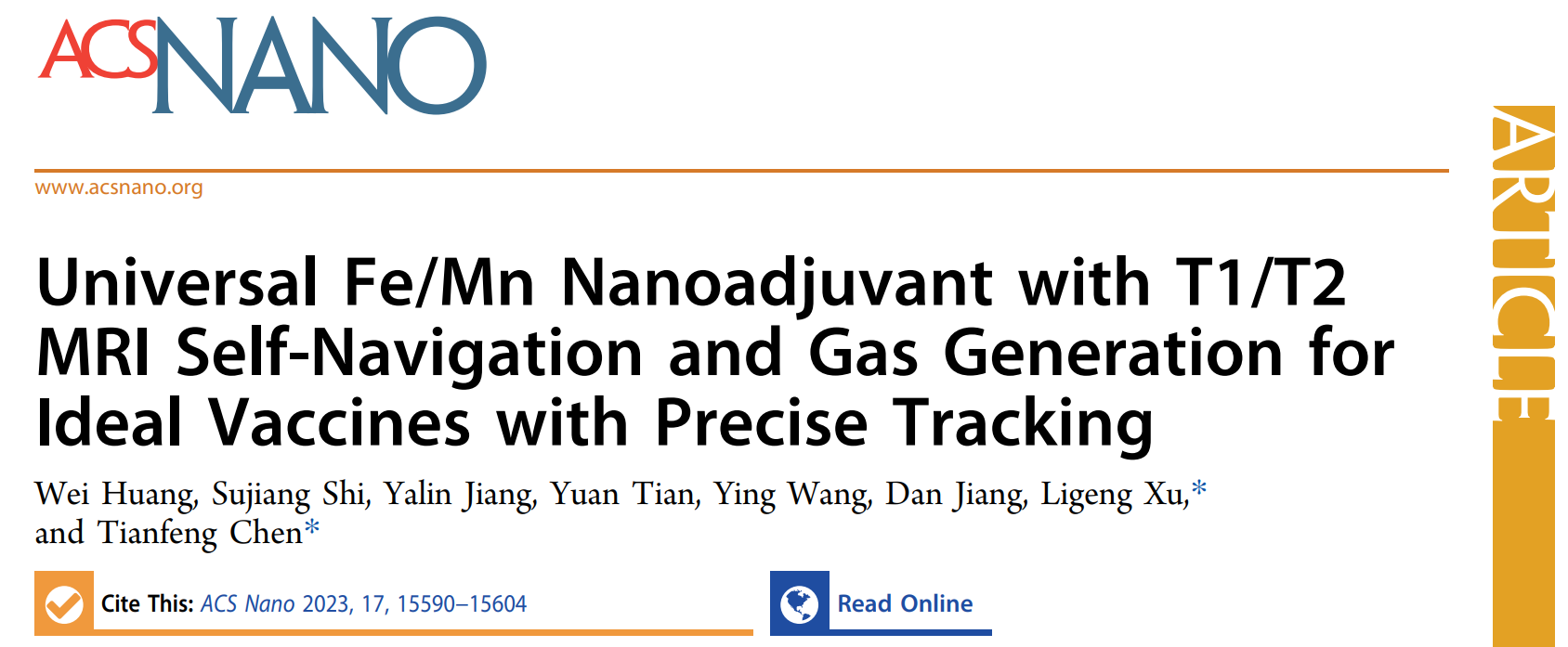 近日,球速体育陈填烽教授/许利耕教授团队在新型疫苗佐剂开发方面取得重要进展,相关成果以“Universal Fe/Mn Nanoadjuvant with T1/T2 MRI Self-Navigation and Gas Generation for Ideal Vaccines with Precise Tracking”为题,发表于国际权威期刊ACS NANO(影响因子17.1),球速体育为唯一通讯单位。这是该团队继开发纳米硒佐剂用于新冠病毒纳米疫苗(STTT, 2023)、灭活病毒纳米疫苗(Small Methods, 2023)等一系列研究工作后取得的又一重要成果。