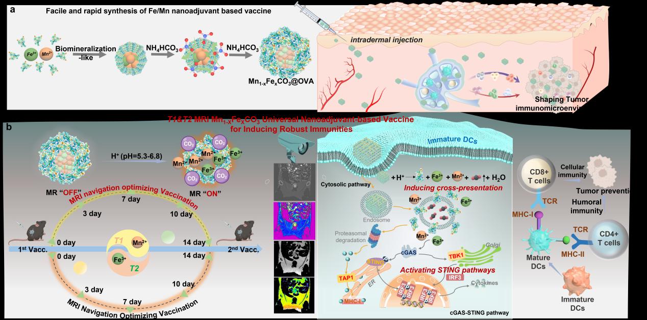 图1. 具有MRI自导航和气体生成功能的通用型铁/锰纳米佐剂用于癌症等重大疾病疫苗。