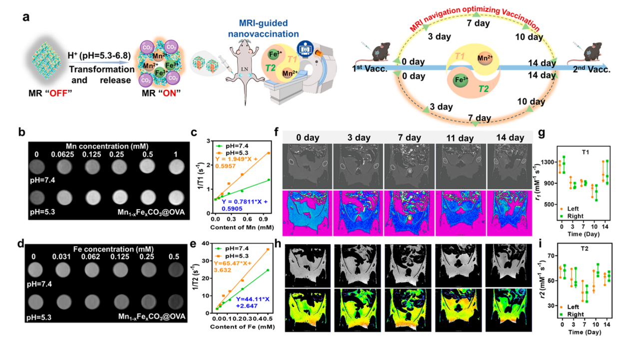 图2. Mn1−xFexCO3@OVA纳米疫苗展示出良好的T1/T2双模态MR成像特性,指导纳米疫苗精准免疫。