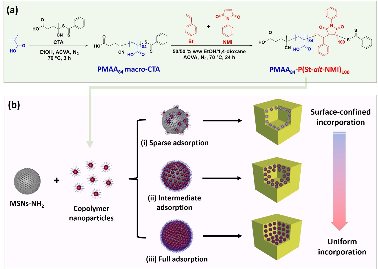 图2.(a)嵌段共聚物纳米粒子的合成;(b)嵌段共聚物纳米粒子在介孔二氧化硅表面的吸附组装,形成具有可控共聚物纳米粒子表面吸附量的纳米复合胶体粒子,进而实现CNPs在方解石晶体中的空间可控内嵌。