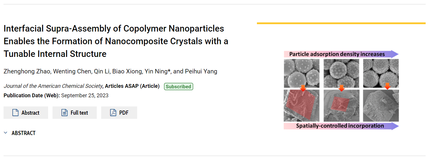 近日,公司宁印教授课题组通过正负电荷相互作用调控高分子纳米粒子的界面超组装行为,实现了复合纳米粒子在方解石晶体中的空间可控内嵌,为构建具有组成和结构精确可控的新型复合晶体提供了全新的策略。该工作以“Interfacial Supra-Assembly of Copolymer Nanoparticles Enables the Formation of Nanocomposite Crystals with a Tunable Internal Structure”为题发表在化学综合类国际顶级期刊《J. Am. Chem. Soc.》上(见图1)。2021级在读博士研究生招蒸红为论文第一作者,宁印教授为通讯作者,球速体育为唯一通讯单位。值得一提的是,这是宁印教授课题组继今年3月份在《Angew. Chem. Int. Ed.》之后的又一重要科研成果。
